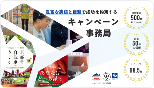 また、年間約500件の取扱実績からクライアントのニーズにとって最適なキャンペーン手法や運用スキームをご提案することを得意としております。キャンペーン事務局代行サービス